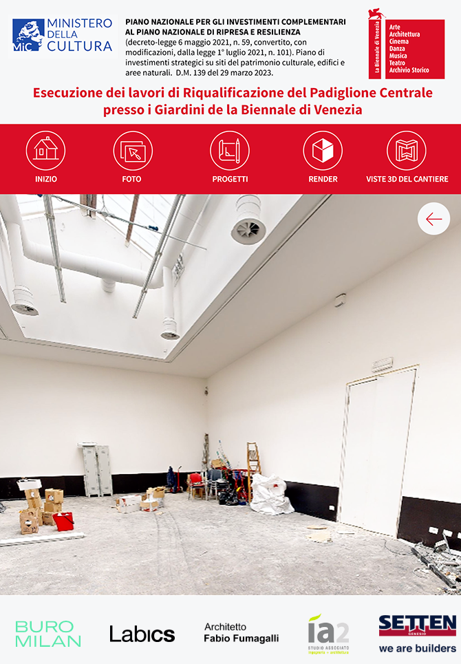 Per il Gruppo Setten, abbiamo curato lo sviluppo del chiosco multimediale dedicato alla narrazione dei lavori di riqualificazione del Padiglione Centrale ai Giardini della Biennale, dall'ideazione dell'interfaccia grafica alla programmazione software