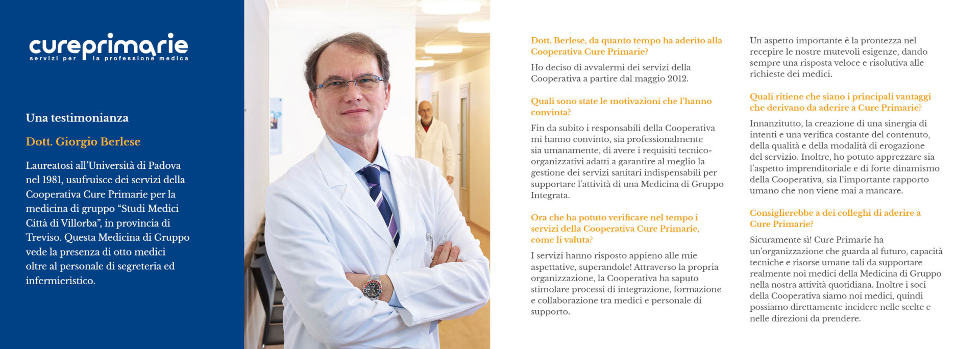 • campagna di comunicazione: focalizzata sul valore del tempo per il medico, sintetizzato nello slogan "Prima di tutto medici, per il resto ci siamo noi".
